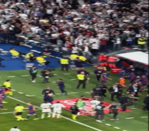 比賽進入傷停補時階段,勝負已定,皇馬主場伯納烏的看臺上響起了熟悉的敵意口號:“Puta Bar?a!”(“巴薩XX!”)——這句粗俗的喊聲長期以來被視為國家德比中皇馬球迷表達敵意的“傳統(tǒng)”。