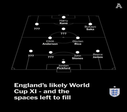 據(jù)The Athletic報(bào)道稱(chēng),英格蘭隊(duì)世界杯7個(gè)首發(fā)位置已確定,貝林厄姆、帕爾默、福登等球員將競(jìng)爭(zhēng)10號(hào)位首發(fā)。